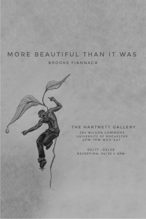 Memories shift and evolve over time, but do we have agency over what they become? Visual artist Brooke Fiannaca explores this question in her two dimensional work. She believes that experiences can be transformed into parables, elevated beyond what they were. Her practice draws upon her own memories. The process of remembering, interpreting, and producing imagery for these moments allows for a narrative to emerge. Fiannaca uses these stories to learn from her own past. An important part of living is to elevate your own experiences, to find meaning in your mistakes and grow from it. More Beautiful Than it Was is the product of that belief.