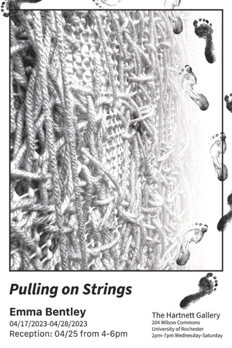Pulling on Strings is motivated by Bentley’s desire to maintain control and follows her development of learning to relinquish oneself to uncertainty. Growing up as a part of a military family, she constantly moved around and had little autonomy in future transitions. She is exhausted by the overwhelming feeling of constantly needing to be in control. To reduce cognitive dissonance, she takes action to lessen the magnitude of her incessant need for order. By concentrating on the act of making rather than the end-product lends itself in Bentley’s practice of disengaging from being in a position of control. The use of strings is labor intensive and requires Bentley to focus on the process in which she surrenders oversight into the results. The various printmaking techniques Bentley uses provides her with different degrees of authority over the resulting prints. With CMYK printing, the process is highly regulated and produces identical prints which allows her to have power over the final prints. In contrast, collagraph prints are profoundly variable which provides Bentley with less regulation over the resulting print. These mixed-media works embody Bentley's introspective reflection through embedded personal information and scale. This new approach to minimize authority over the results documents her progress made in renouncing control over the outcome, both artistically and personally.